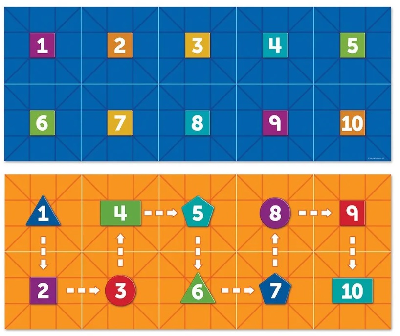 Podložka ponúka matematické úlohy (sčítanie, odčítanie, násobenie, delenie, číselný rad, párne/nepárne čísla) s dôrazom na základy programovania. Predná strana podložky prináša číselný rad od 1 do 10, zadná číselný rad od 1 do 10 s geometrickými tvarmi.