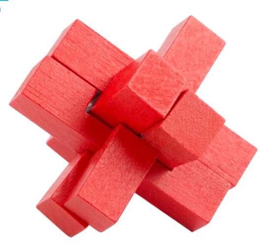 Farbný drevený hlavolam zo 100% FSC dreva, rozmer 4,5 x 4,5 x 4,5 cm.