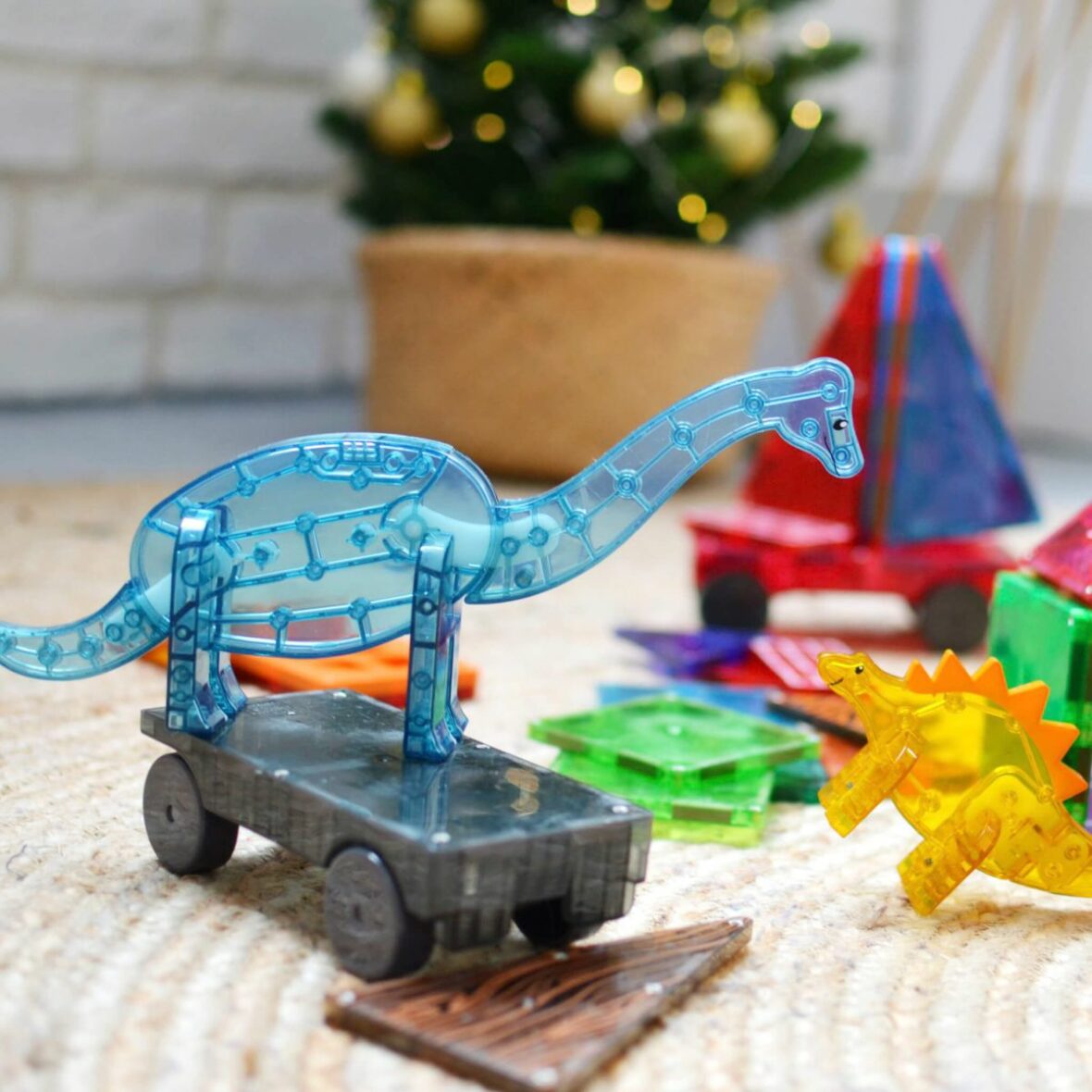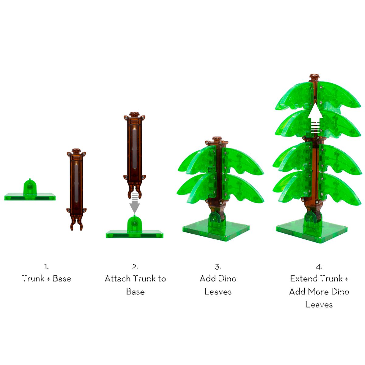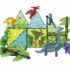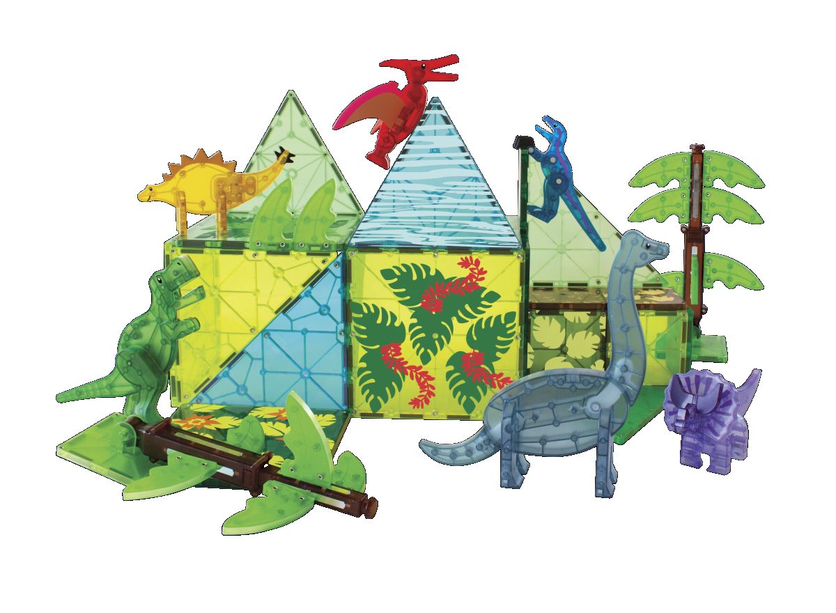 Sada obsahuje 50 magnetických dielikov: 6x figúrka dinosaurov – Pteranodon (červený), T-Rex (zelený), Stegosaurus (žltý) a Velociraptor (modrý), Triceratops (fialový) a Brachiosaurus (bridlicovo modrý), 6x veľký štvorec, 6x veľký pravouhlý trojuholník, 4x veľký rovnostranný trojuholník, 8x štvorec, 2x pravouhlý trojuholník, 16x list stromov, 2x stromová základňa.