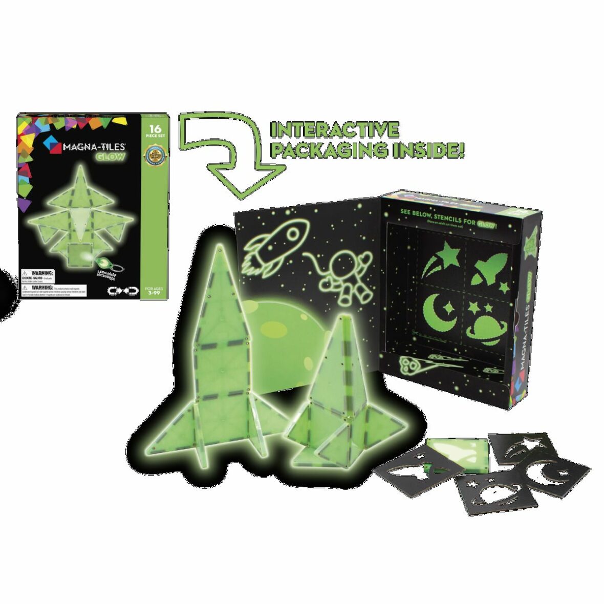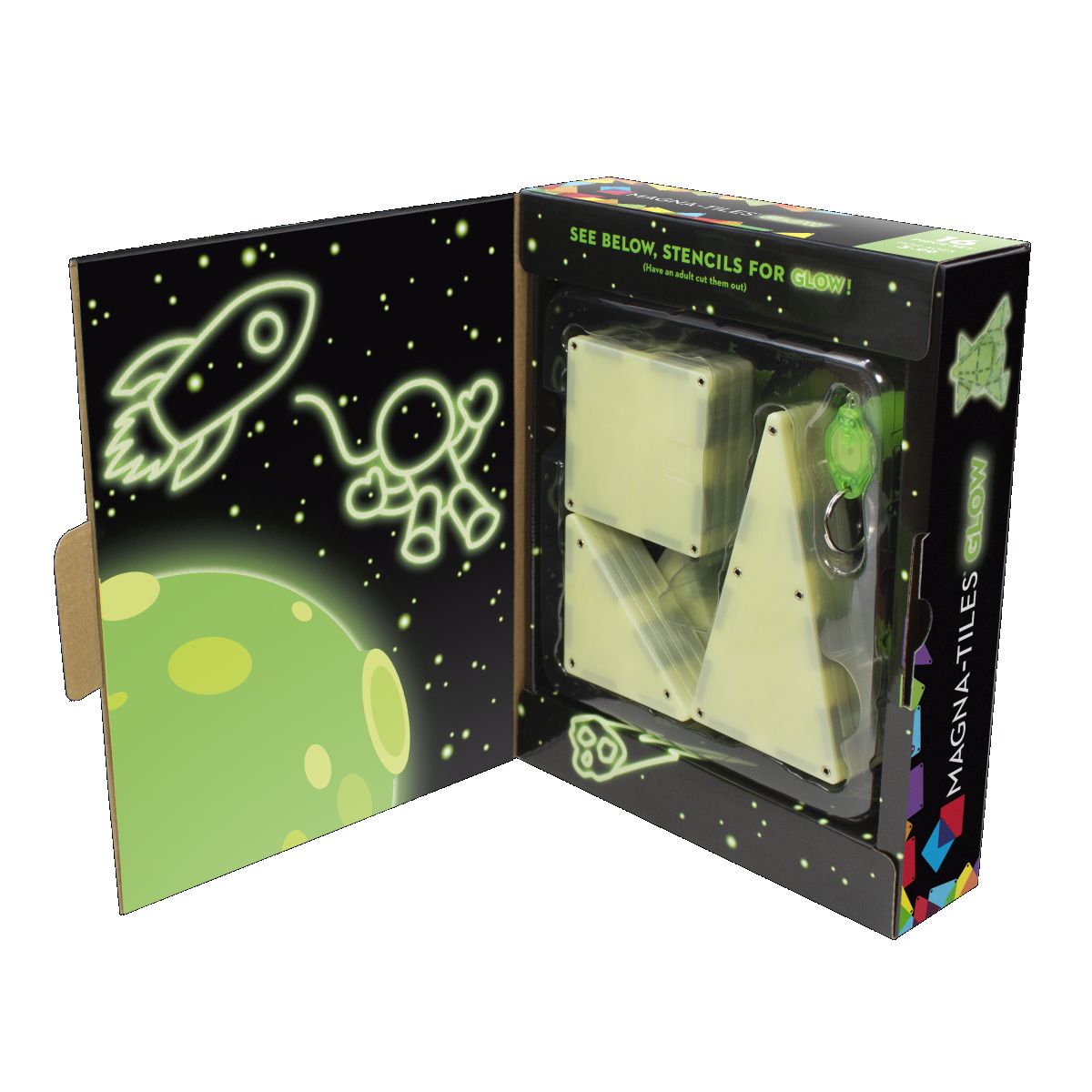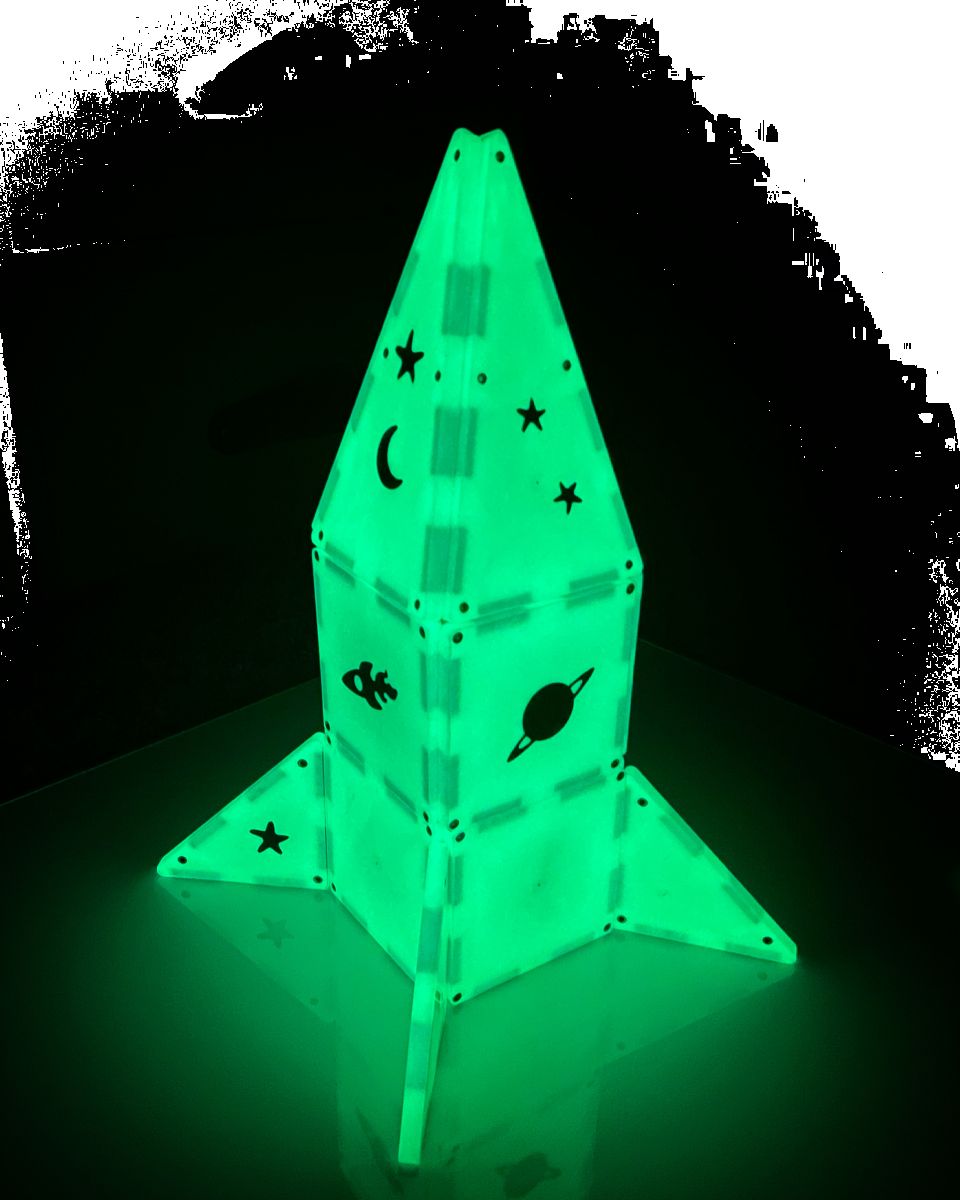 S jedinečnými žiariacimi magnetickými dielikmi vytvoríte svietiace hrady či rakety. Sada obsahuje dieliky, ktoré svietia v tme a predstavujú zábavný a originálny doplnok k existujúcim sadám Magna-Tiles.