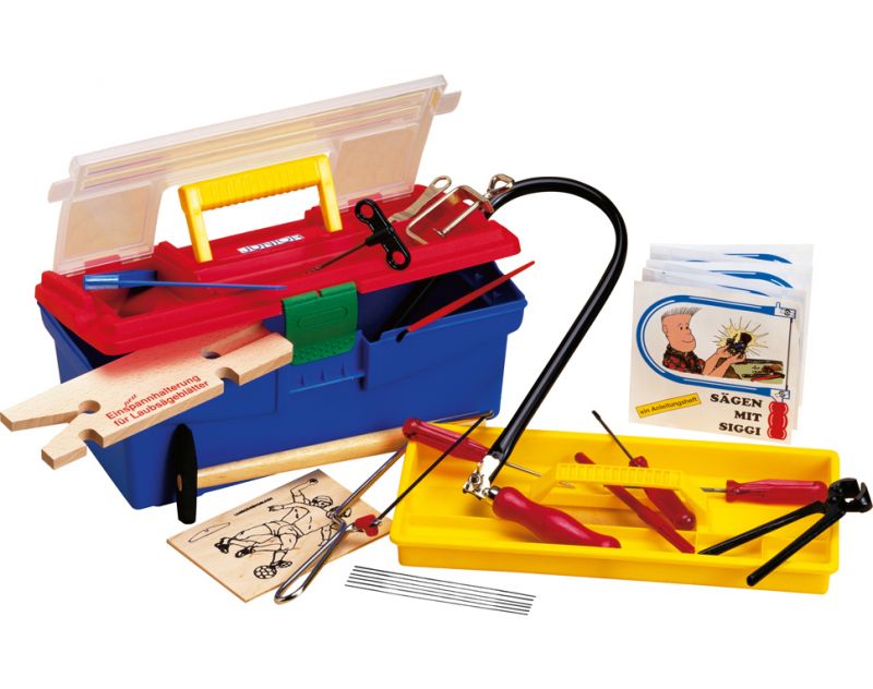 Plastový kufrík obsahuje rôzne druhy ručného náradia bezpečného pre deti ako napr. lupienková pílka, ručná pílka, uholník, kliešte, kladivo, skrutkovače, nebožiec atď. Priložené sú tiež podrobné pokyny na prácu. Rozmery: 34x20x15,5 cm. Hmotnosť: 1,68 kg.