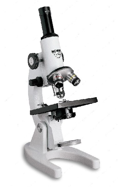 Študentský biologický mikroskop s kovovým telom a sklenenými achromatickými šošovkami. Zväčšenie do 600x.