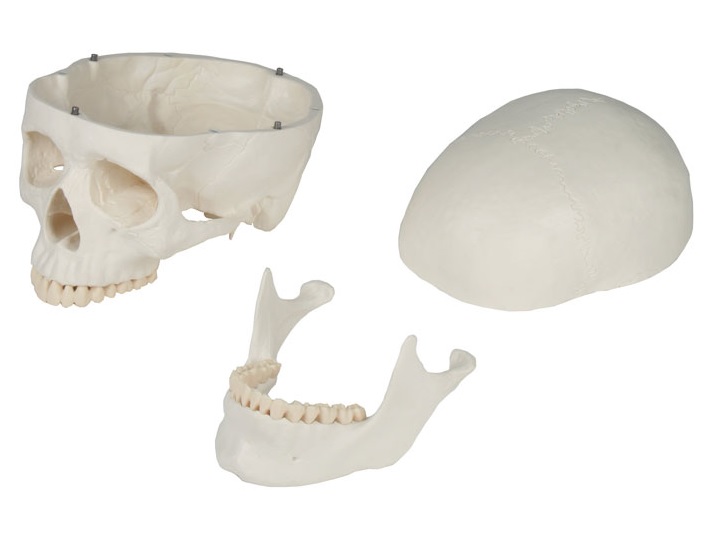 Model lebky, 3-dielny. Model lebky má všetky anatomické detaily a štruktúry. Trojdielny model sa skladá z lebky, lebečnej klenby a dolnej čeľuste.