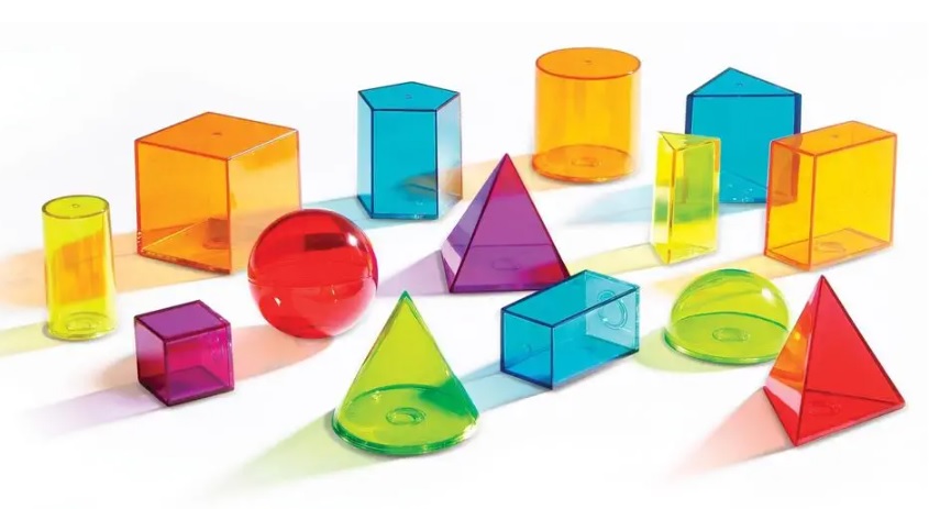 Priehľadné geometrické telesá v pestrých farbách umožnia deťom ľahšie preskúmať geometriu, obsah a koncept merania. Odnímateľné základy umožňujú vidieť 3D telesá v 2D. Telesá možno naplniť kvapalinou alebo sypkými látkami (ryža, múka) a ľahko ich vyčistiť.